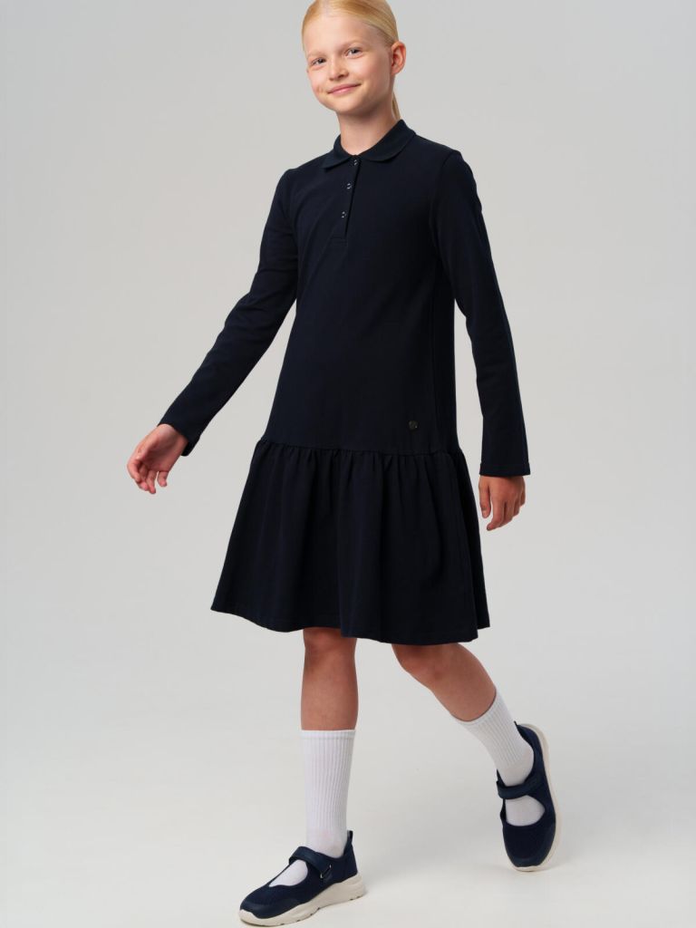 Модное тёмно-синее трикотажное платье поло в школу для девочки от PlayToday — это практичный и стильный выбор для тех, кто ценит комфорт, уверенность и аккуратность в повседневной жизни.