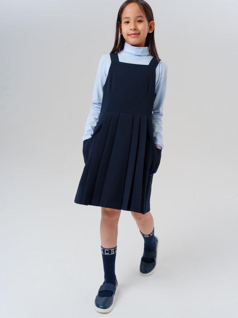 Классическое тёмно-синее школьное текстильное платье сарафан non iron для девочки подростка от PlayToday — элегантное детское платье, которое сочетает в себе строгость, комфорт и универсальность. Идеален как для повседневных школьных будней, так и для особых мероприятий — 1 сентября, праздников и выпускных.