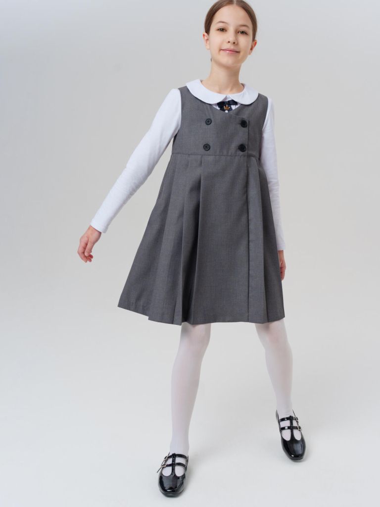 Серый цвет и лаконичный дизайн делают этот элегантный детский сарафан для школы универсальным: он соответствует строгому дресс-коду, но при этом легко превращается в наряд для праздников или торжественных событий, таких как 1 сентября, линейки и концерты.