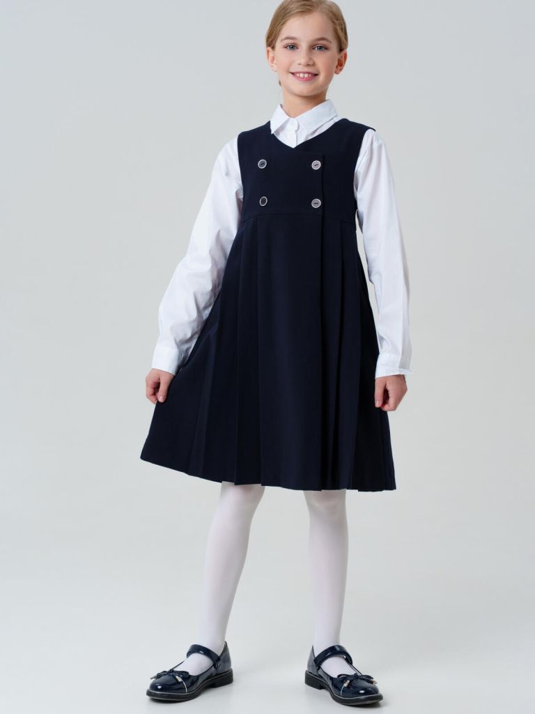 Тёмно-синий школьный сарафан non iron для девочки подростка от PlayToday — классическая модель, в которой сочетаются элегантность, практичность и комфорт. Подходит как для повседневной носки, так и для торжественных школьных мероприятий.