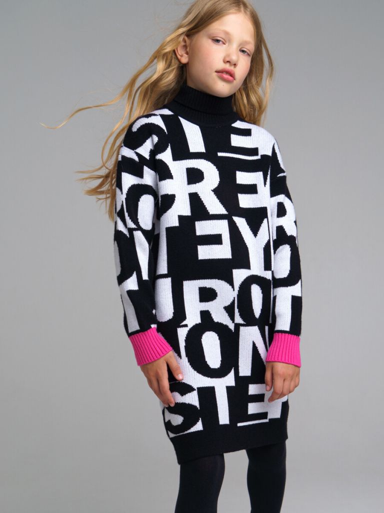 Жаккардовое платье из вязаного трикотажа прямого силуэта. Воротник и манжеты в рубчик