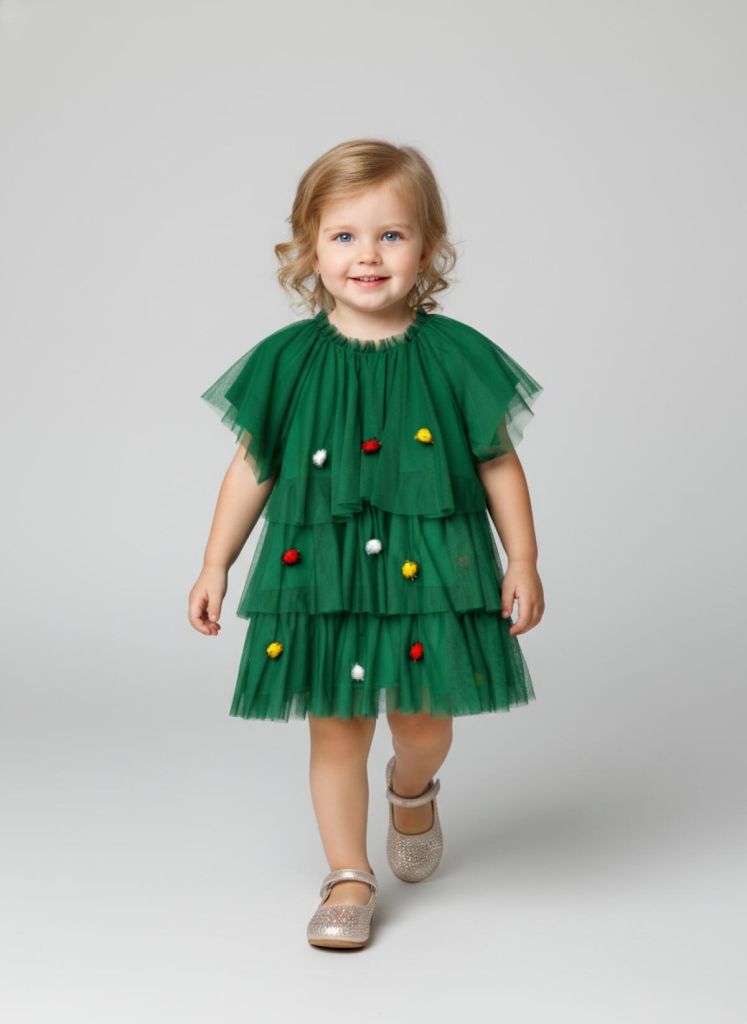 Платье карнавальное - ёлочка. Подкладка из трикотажа с высоким содержанием хлопка 95%. Благодаря наличию эластана в составе ткани, изделие держит форму и меньше мнется. Без застежек. Сверху мягкая сетка, декорированная разноцветными помпонами.