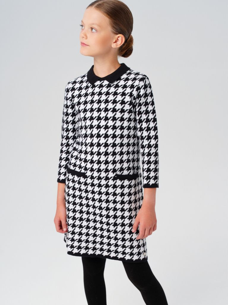 Платье жаккардовое. Силуэт трапеция. Застежка сзади на пуговицы. Карманы.