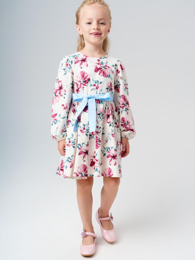 Красивое трикотажное платье с поясом и цветочным принтом для девочки — идеальный вариант на праздник, утренник и каждый день от PlayToday.