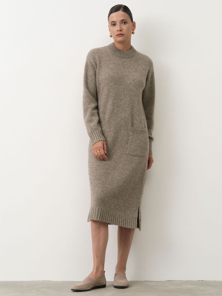 Модель прямого кроя с длинными рукавами и удобными карманами на передней части подчеркнет Вашу элегантность и чувство стиля. Нейтральный серый цвет легко сочетается с любыми аксессуарами и обувью, что делает это платье универсальным выбором для повседневной носки или деловых встреч.
