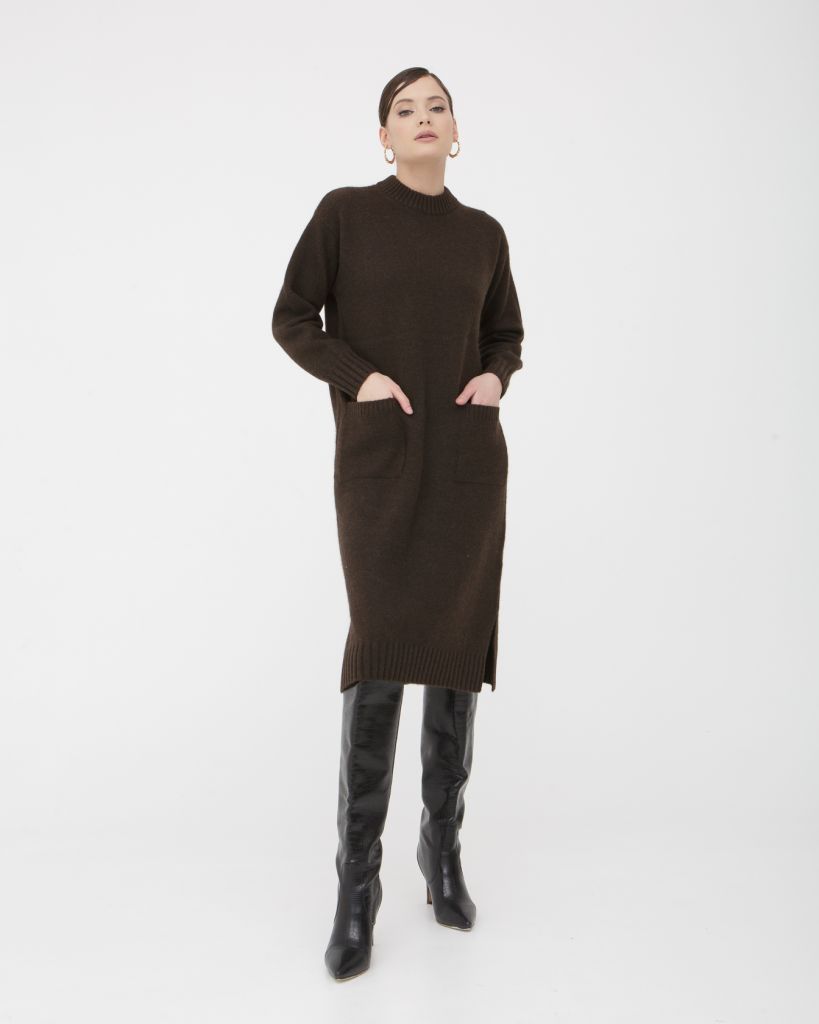 Платье оснащено удобными карманами, которые добавляют функциональности и практичности, а темно-коричневый цвет подчеркивает его универсальность и элегантность. Оно легко сочетается с разной обувью и аксессуарами, создавая стильные образы на каждый день.