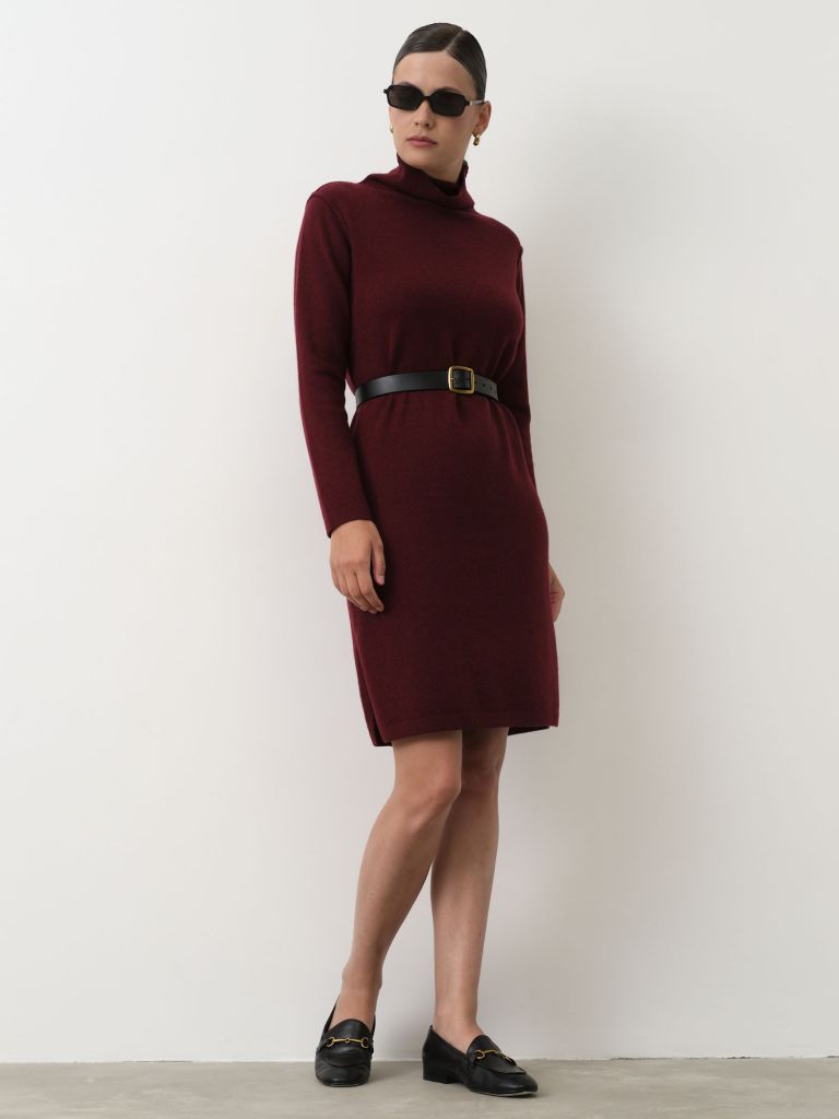 Лаконичное платье из пуха яка в насыщенном бордовом оттенке сочетает минимализм и уют премиального материала. Прямой силуэт и длина выше колена создают универсальный крой, подходящий для повседневных и офисных образов. Высокий воротник-гольф добавляет тепла и утончённости, а длинные рукава обеспечивают комфорт в прохладное время года. Благодаря мягкости и терморегулирующим свойствам пуха яка платье приятно к телу и отлично сохраняет тепло, оставаясь лёгким и дышащим. Идеально носится как самостоятельно, так и в сочетании с сапогами или плотными колготками.