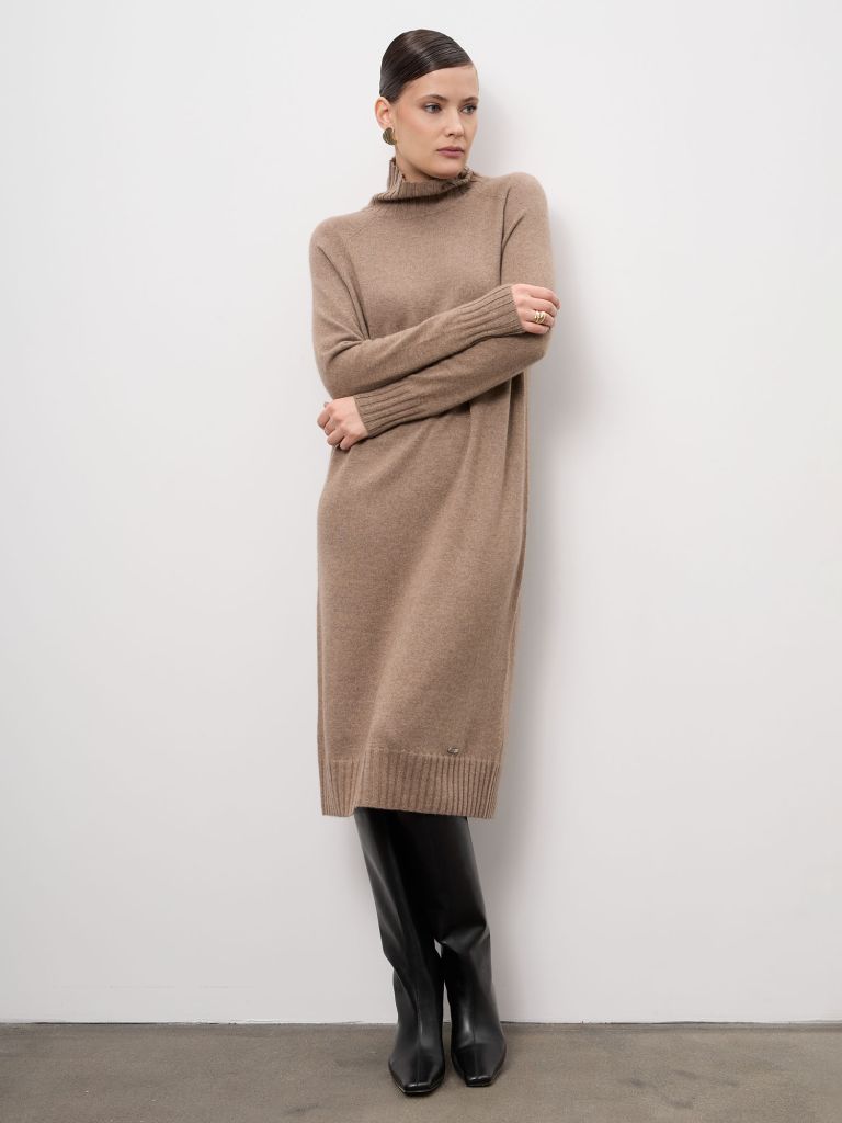 Элегантное платье из натурального кашемира в оттенке капучино — воплощение сдержанной роскоши и комфорта. Модель прямого силуэта мягко повторяет линии фигуры, создавая утончённый и женственный образ. Благородный цвет легко вписывается в базовый гардероб и подходит для любого сезона.Материал:Изготовлено из высококачественного кашемира — натурального волокна, известного своей исключительной мягкостью, лёгкостью и способностью сохранять тепло без перегрева. Приятно к телу, подходит для чувствительной кожи.Крой и детали:Платье выполнено в лаконичном дизайне с длинными рукавами и аккуратной горловиной. Эластичные манжеты и нижний край обеспечивают комфортную посадку и аккуратный внешний вид. Минималистичный стиль подчёркивает премиальность материала.Посадка и комфорт:Свободная, но выверенная посадка не сковывает движений и подходит для повседневной носки, офиса или уютных выходов. Платье легко комбинируется с сапогами, ботильонами и аксессуарами.Уход:Рекомендуется бережная ручная стирка в прохладной воде или профессиональная химчистка. Сушить в разложенном виде, избегая растягивания и прямых источников тепла. Готовую памятку по уходу вы можете прочитать у нас в блоге.