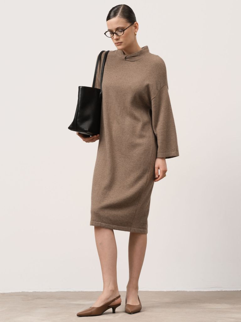 Кашемировое платье в оттенке капучино — идеальное сочетание стиля и комфорта для прохладных дней. Мягкий, нежный кашемир обеспечивает приятные тактильные ощущения и максимальное тепло. Свободный крой с расклешенными рукавами создает элегантный силуэт, подчеркивая утонченность образа. Универсальный оттенок капучино позволяет легко сочетать это платье с различными аксессуарами и обувью, создавая разнообразные образы для любых ситуаций. Идеальный выбор для тех, кто ценит стиль и качество.