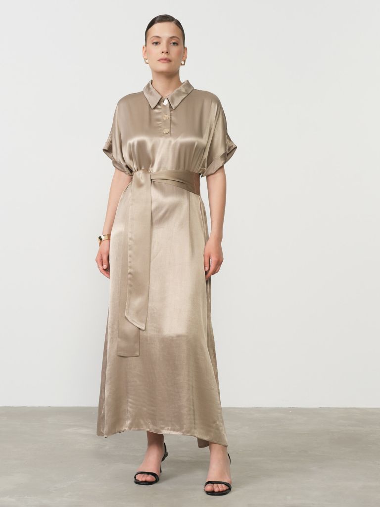 Изящное платье из натуральной вискозы в благородном бежевом цвете – воплощение утонченной элегантности для современной женщины. Выполненное из премиальной 100% вискозы, это платье отличается особой мягкостью, шелковистой текстурой и легкостью, обеспечивая максимальный комфорт при носке в любое время года. Изысканный бежевый оттенок придает модели универсальность и благородство, делая её идеальным выбором как для деловых встреч, так и для особых случаев.Элегантный воротник-стойка с декоративными пуговицами создает утонченный акцент, подчеркивая линию шеи и добавляя образу изысканности. Свободный крой обеспечивает комфорт и свободу движений, а пояс на талии формирует женственный силуэт и выгодно подчеркивает фигуру. Рукава с аккуратными манжетами завершают элегантный образ.Натуральная вискоза обладает превосходными гигиеническими свойствами – она прекрасно дышит, отводит влагу и не вызывает раздражения даже при длительной носке. В этом платье вы будете чувствовать себя комфортно в течение всего дня, сохраняя безупречный внешний вид. Бежевый цвет легко сочетается с различными аксессуарами, позволяя создавать как сдержанные деловые, так и яркие праздничные образы.Дополните свой гардероб этим универсальным платьем, которое станет основой для множества стильных образов и подчеркнет вашу естественную красоту и безупречный вкус!