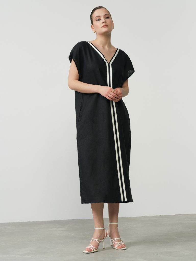 V-образный вырез визуально вытягивает силуэт. Контрастная вертикальная отделка спереди добавляет графичности и делает образ более стройным и современным.