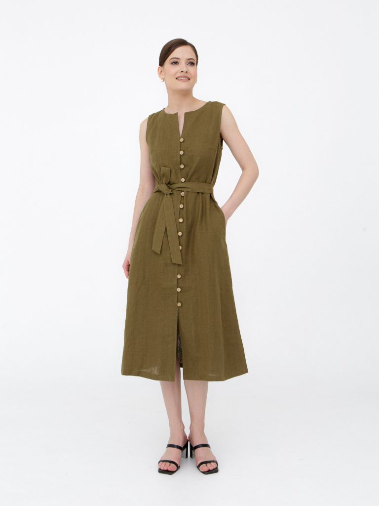 Натуральный лен, из которого изготовлено платье, обладает уникальными свойствами, особенно ценными в теплое время года. Этот экологичный материал отличается превосходной воздухопроницаемостью, способностью отводить влагу от тела и естественно регулировать температуру. Благодаря этому, в льняном платье вы будете чувствовать себя комфортно даже в самые жаркие дни.Темный хаки – универсальный и благородный оттенок, который прекрасно смотрится на любом типе внешности. Этот цвет ассоциируется с природой, спокойствием и уверенностью, добавляя образу элегантности и глубины. Платье отлично подходит для различных случаев – от повседневных прогулок до деловых встреч и вечерних мероприятий. Сочетайте его с минималистичными аксессуарами для создания элегантного дневного образа или дополните яркими украшениями и каблуками для вечернего выхода. Универсальность этой модели делает ее незаменимой в гардеробе современной женщины.Одним из главных преимуществ льняной одежды является ее долговечность и экологичность. Натуральный лен с каждой стиркой становится только мягче и приятнее к телу, при этом сохраняя свою форму и цвет. Покупая изделие из натурального льна, вы делаете выбор в пользу качества, которое будет радовать вас на протяжении многих сезонов.Не упустите возможность пополнить свой гардероб этим элегантным льняным платьем в оттенке темный хаки! Закажите прямо сейчас и ощутите все преимущества натуральных материалов – комфорт, практичность и стиль, который никогда не выходит из моды.