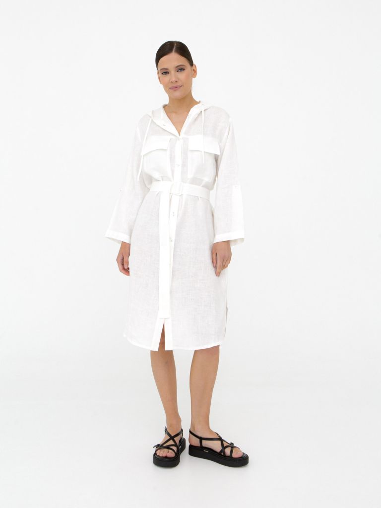 Это платье выполнено из смеси льна и хлопка, что делает его легким, приятным на ощупь и дышащим материалом, идеально подходящим для теплой погоды. Белый цвет придает ему чистоту и свежесть, делая его универсальным и подходящим для различных событий и мероприятий. Платье имеет свободный крой, который не слишком обтягивает тело, что обеспечивает комфорт и свободу движения. Капюшон добавляет дополнительный элемент защиты от солнца и легкий, спокойный образ. Платье также оснащено ремнем, который позволяет подчеркнуть талию и создать более приталенный силуэт. Пуговицы на платье позволяют легко и быстро одевать и снимать платье, а также добавляют дополнительный элемент декора.