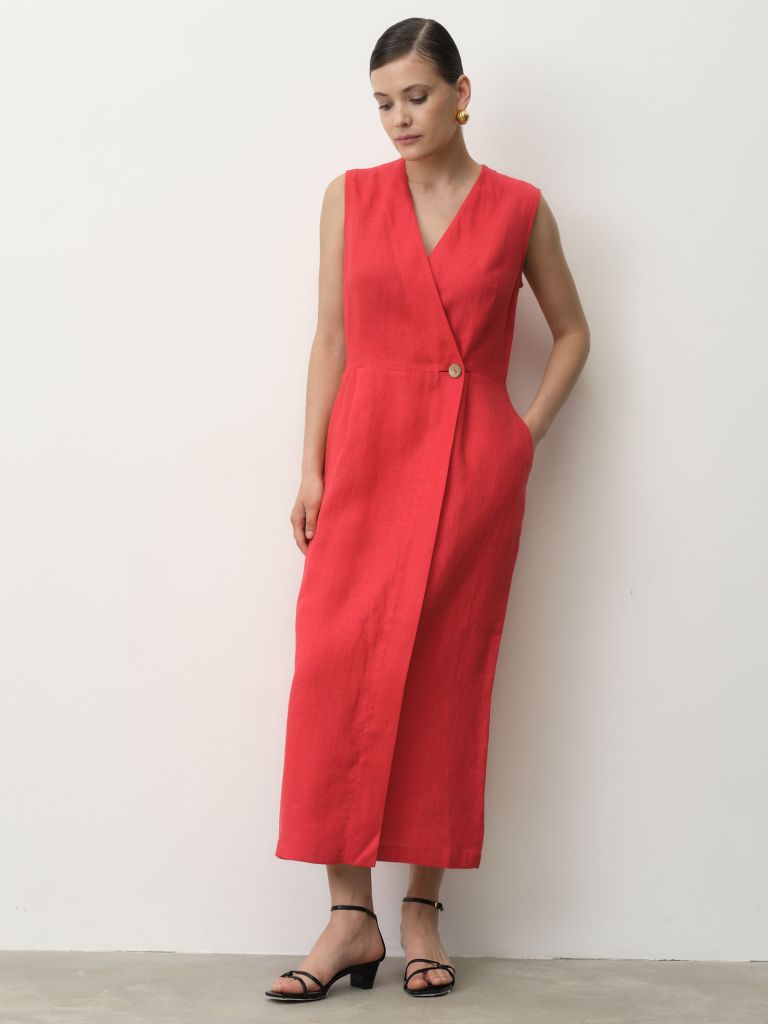 Яркое женское платье из натурального льна в насыщенном алом цвете — это сочетание природной текстуры и выразительности. Оно придаёт образу уверенность и свежесть, оставаясь при этом дышащим и комфортным даже в самый жаркий Лён естественно охлаждает кожу, не прилипает к телу, впитывает влагу и быстро сохнет. Алый — яркий, энергичный оттенок красного, который подчёркивает женственность и привлекает внимание Платье подходит как для повседневной носки, так и для летних мероприятий, отпусков или прогулок по городу.Уход: Рекомендуется деликатная стирка при низких температурах. Со временем лён становится мягче, сохраняя прочность и форму.Размерная сетка