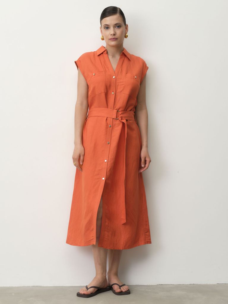 Платье из льна и тенселя в терракотовом оттенке — стильный базовый элемент гардероба. Простой, чистый крой подчеркивает элегантность и естественность. Материал сочетает в себе прочность льна и мягкость тенселя, что делает платье одновременно структурированным и комфортным. Ткань приятна к телу, не вызывает перегрева даже в самые жаркие дни. Подходит для офиса, городских прогулок и путешествий. Терракотовый цвет придаёт образу тепло и выразительность, а лаконичный дизайн позволяет легко сочетать с различной обувью и аксессуарами.