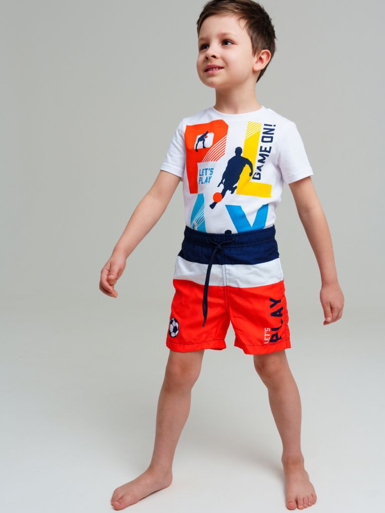 Плавательные шорты из быстросохнущего материала с водоотталкивающей пропиткой для мальчика. Бордшорты детские (swimshort) средней длины. Модель с подкладкой из мягкой сетки в виде трусов, карманы из сетки. Пояс на резинке с дополнительной регулировкой по талии шнурком. Благодаря UF-защите, ткань сохраняет первоначальный вид даже при длительном пребывании на солнце.
