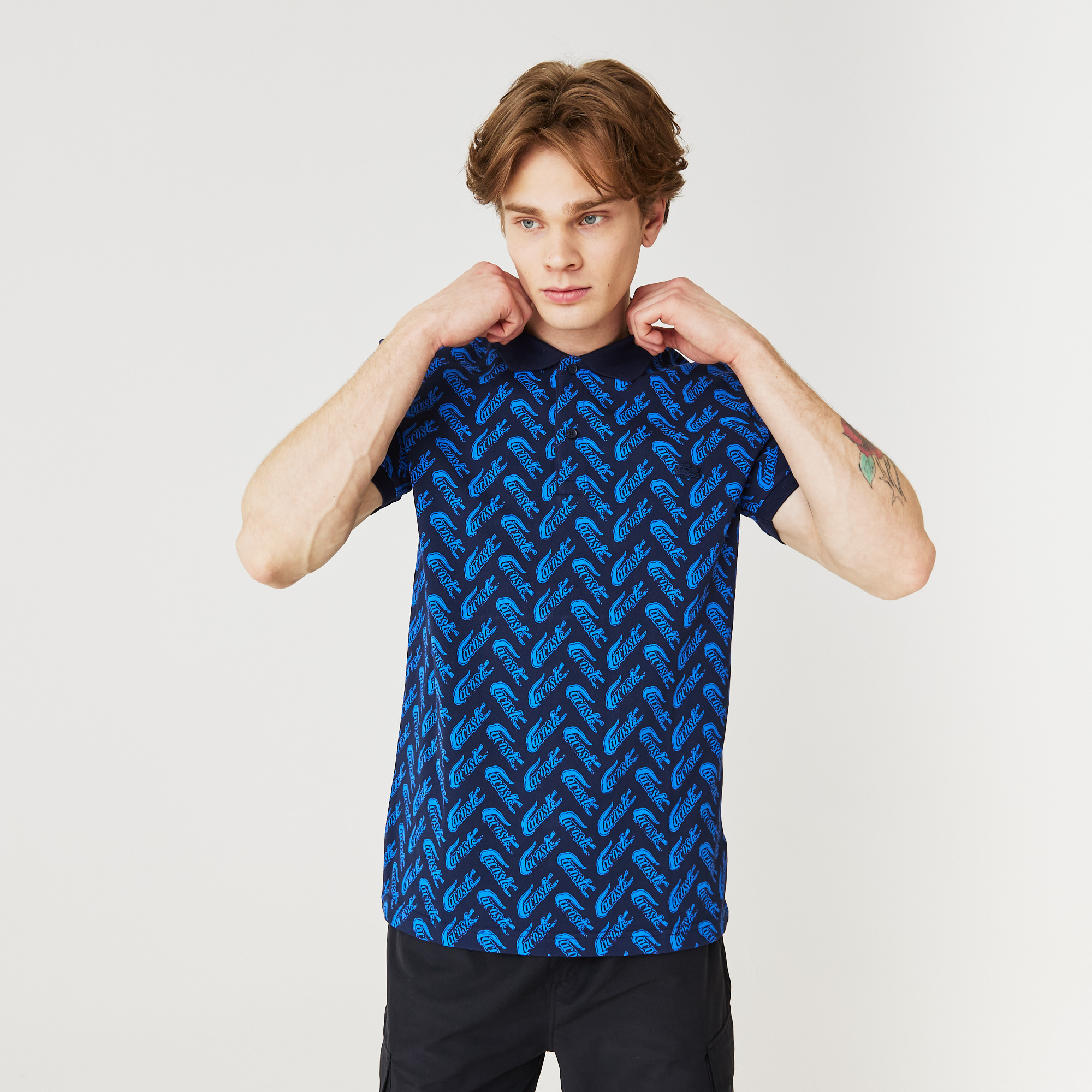Воротник-поло;\Пуговицы на планке;\Надпись Lacoste и крокодил по всему изделию;\Вышитый логотип Lacoste на груди;\96% хлопок 4% эластан