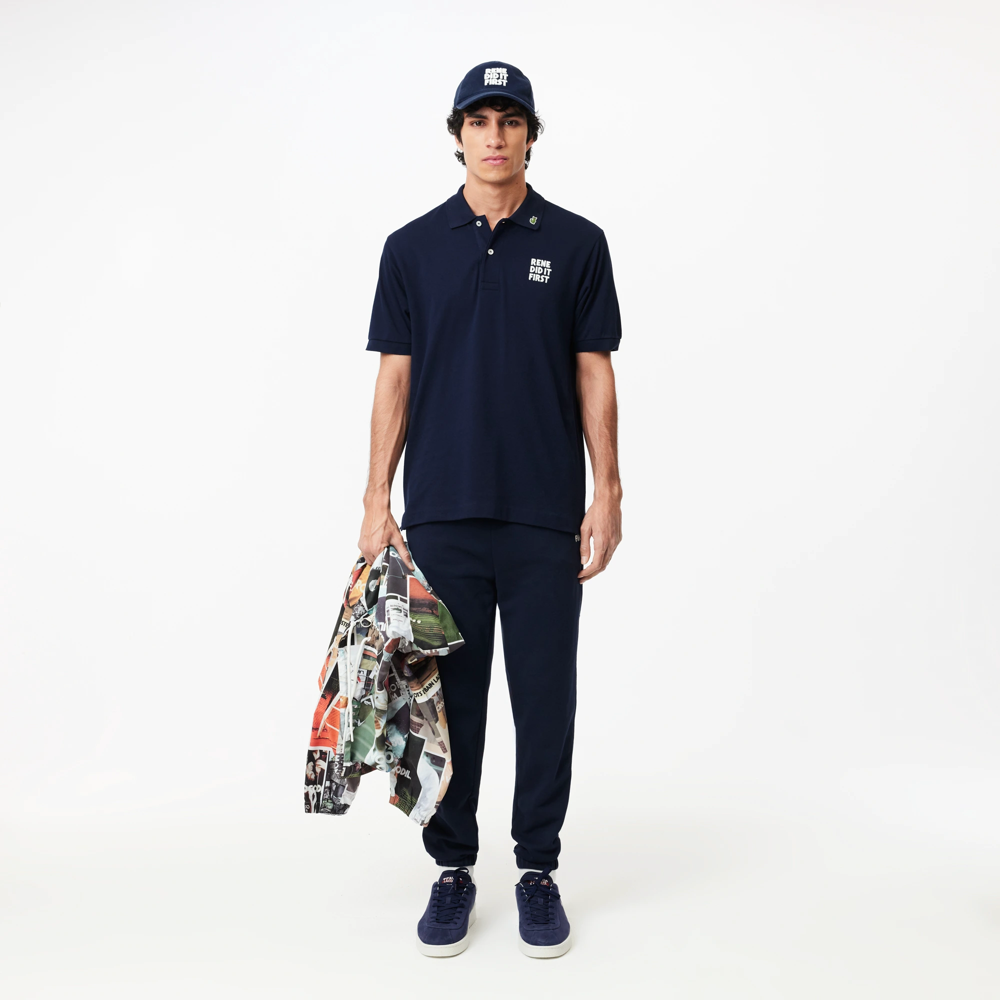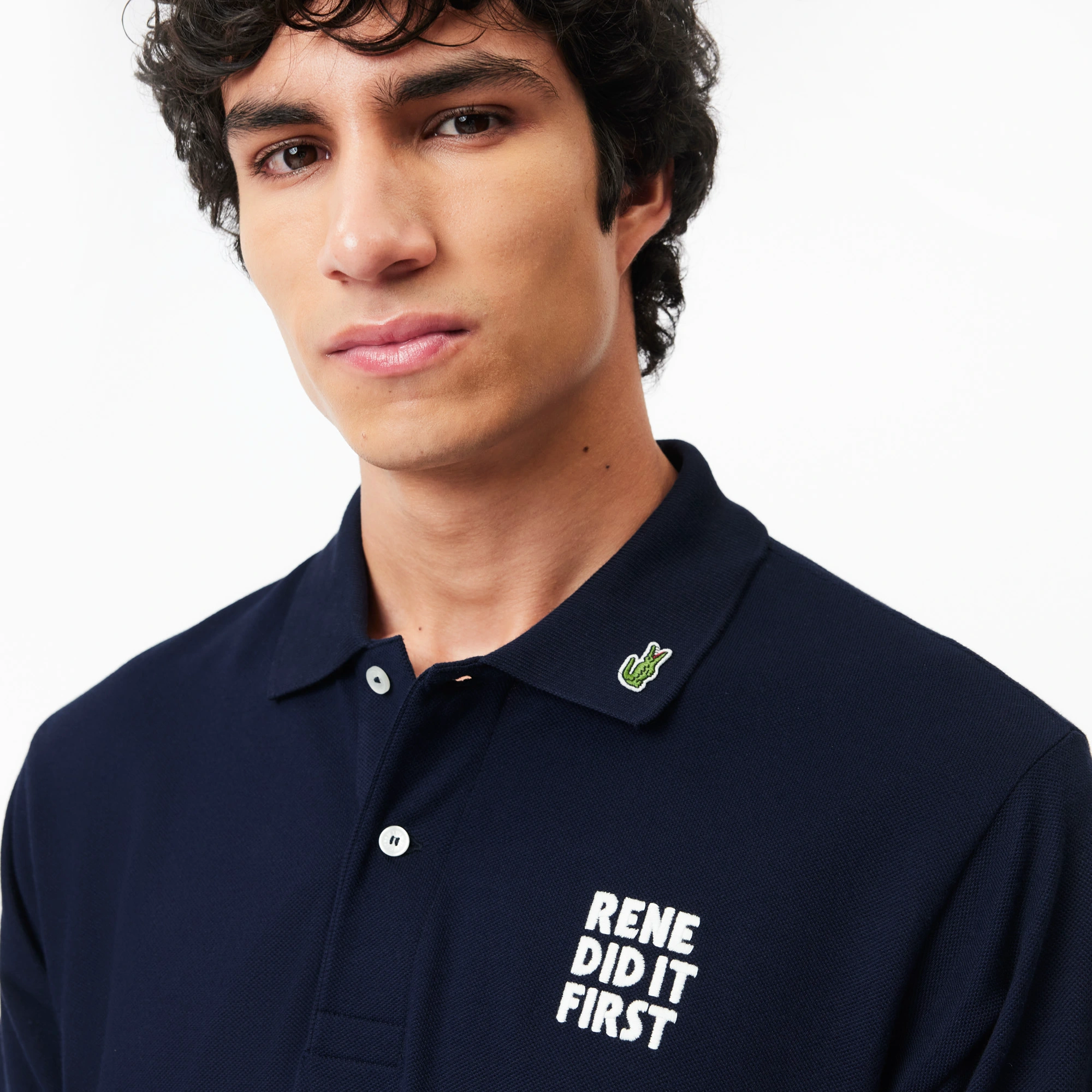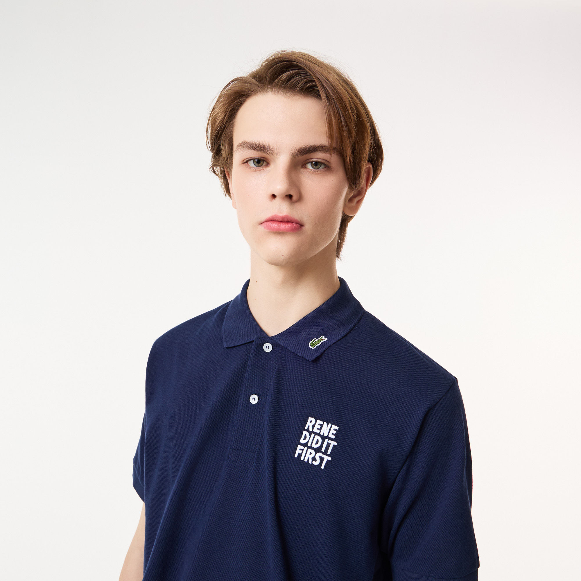 Воротник-поло на пуговицах\Органический хлопок piqué\Пуговицы с гравировкой "René did it first"\Принт на груди\Логотип на воротнике\Материал: верх-100% органический хлопок\Рост модели 186 см, размер одежды 4-M
