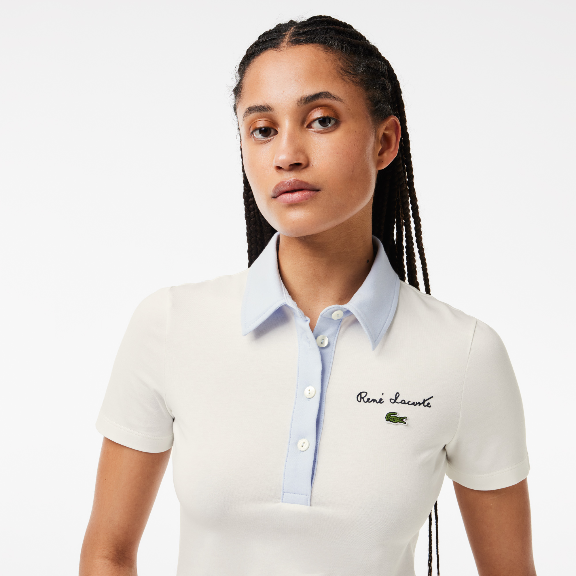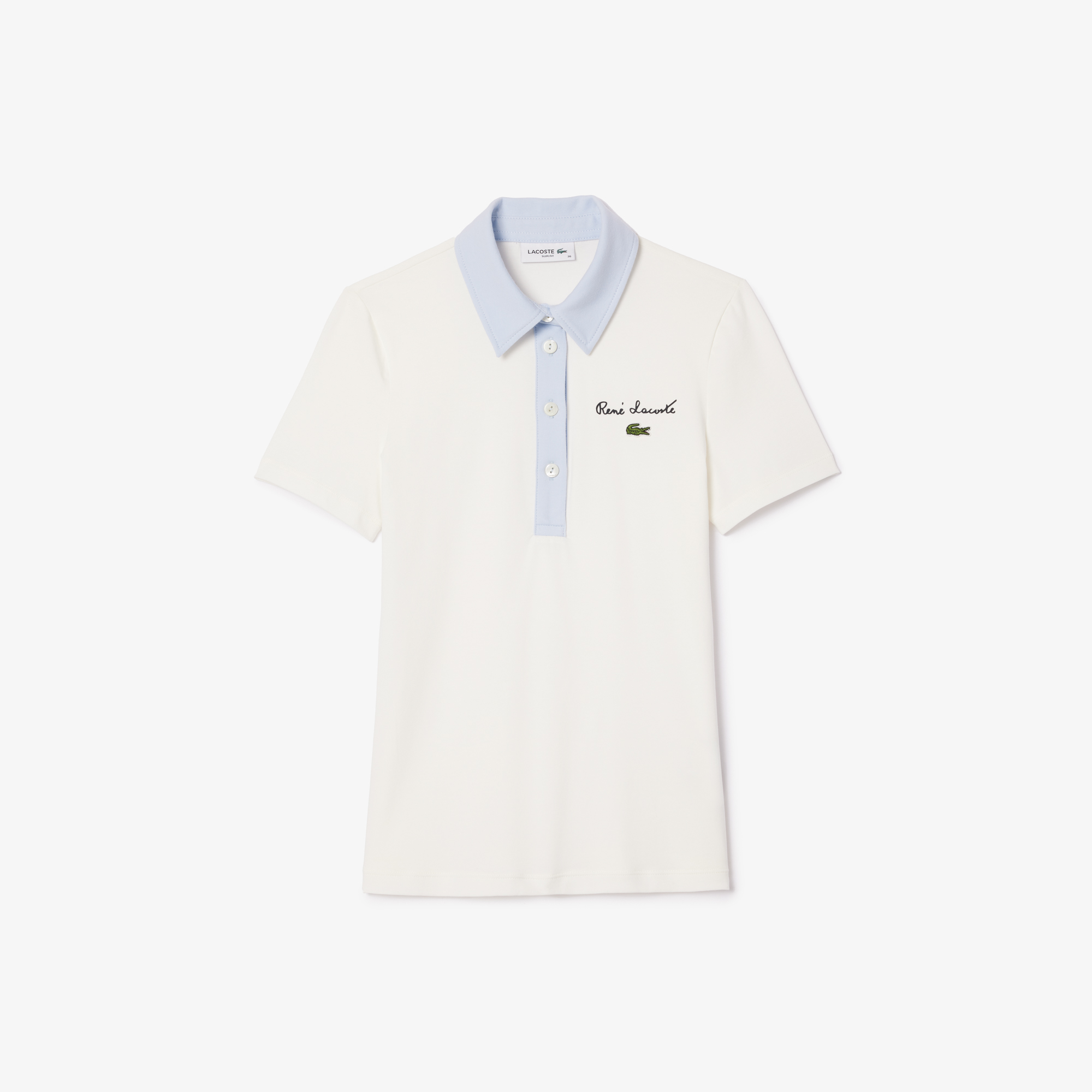 Контрастная рубашка поло из эластичного джерси Slim Fit \ Органический хлопок \ Приталенный крой \ Воротник Поло \ Планка на пуговицах \ Вышитый логотип на груди \ Органический хлопок\Воротник поло\Планка на пуговицах\Вышивка "René Lacoste" и л