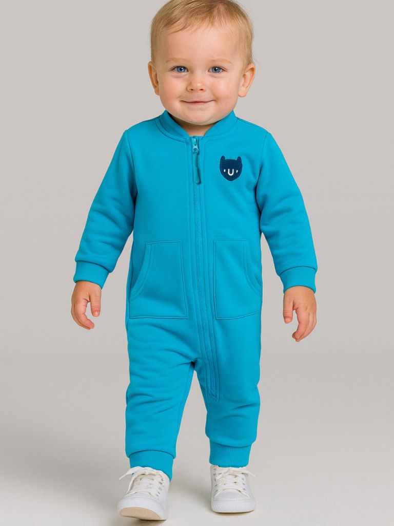 Бирюзовый детский комбинезон из футера с начёсом для мальчика от PlayToday — удобный и практичный трикотажный комбинезон, который идеально подойдёт для сада, прогулок и игр.