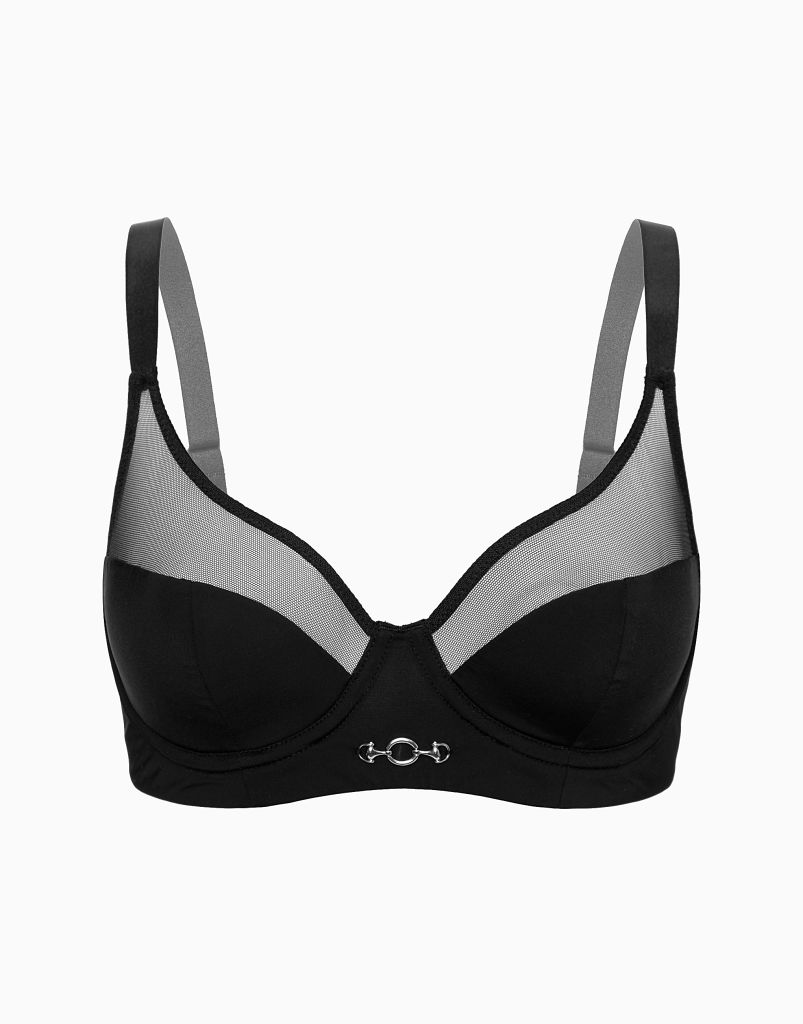 Бюстгальтер с мягкими чашками и спонжевой поддержкой на стане. Мягкие чашки имеют Т-образный рельеф. Верхняя часть чашек выполнена из тонких прозрачных материалов. Нижняя часть на спонже.