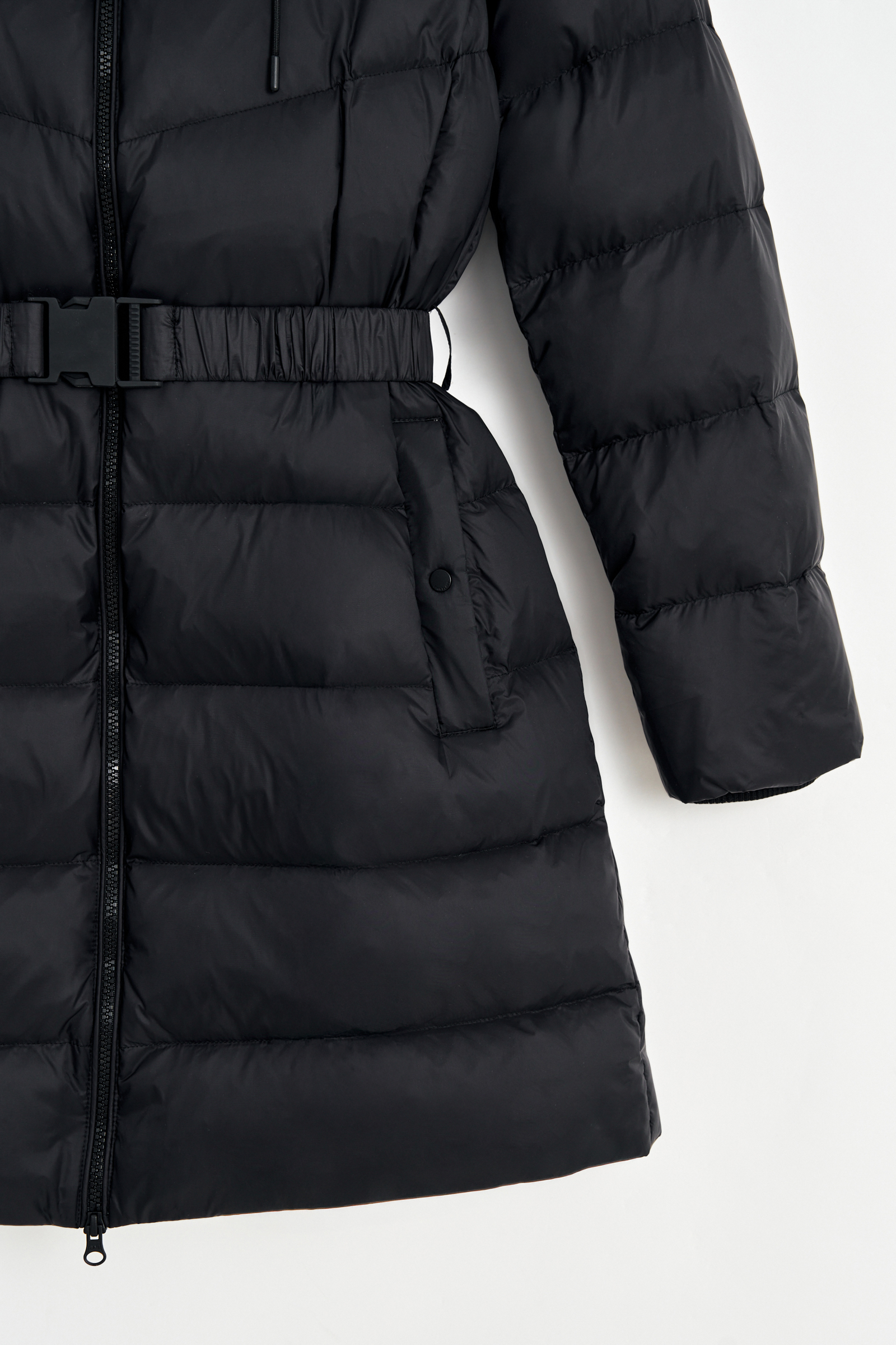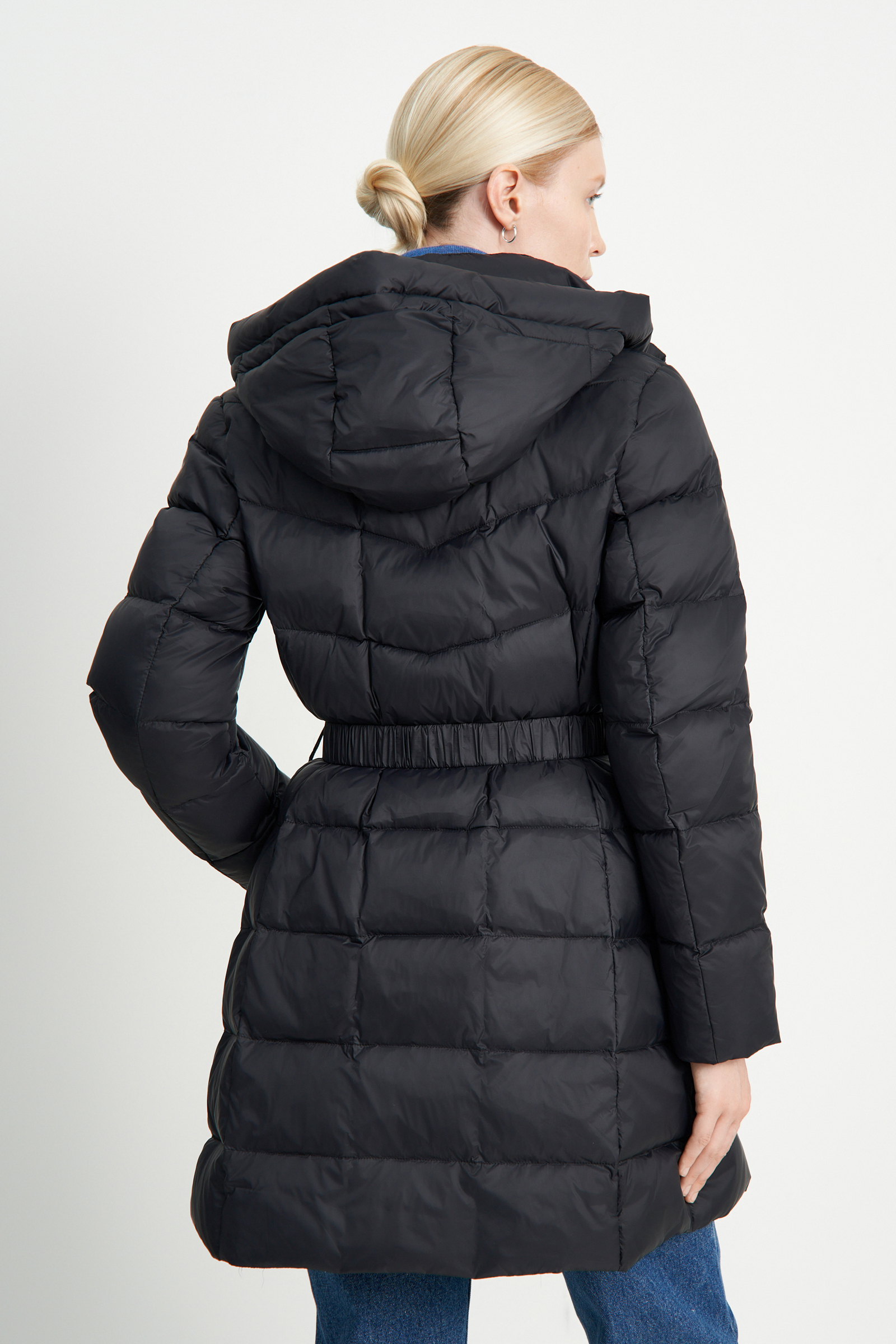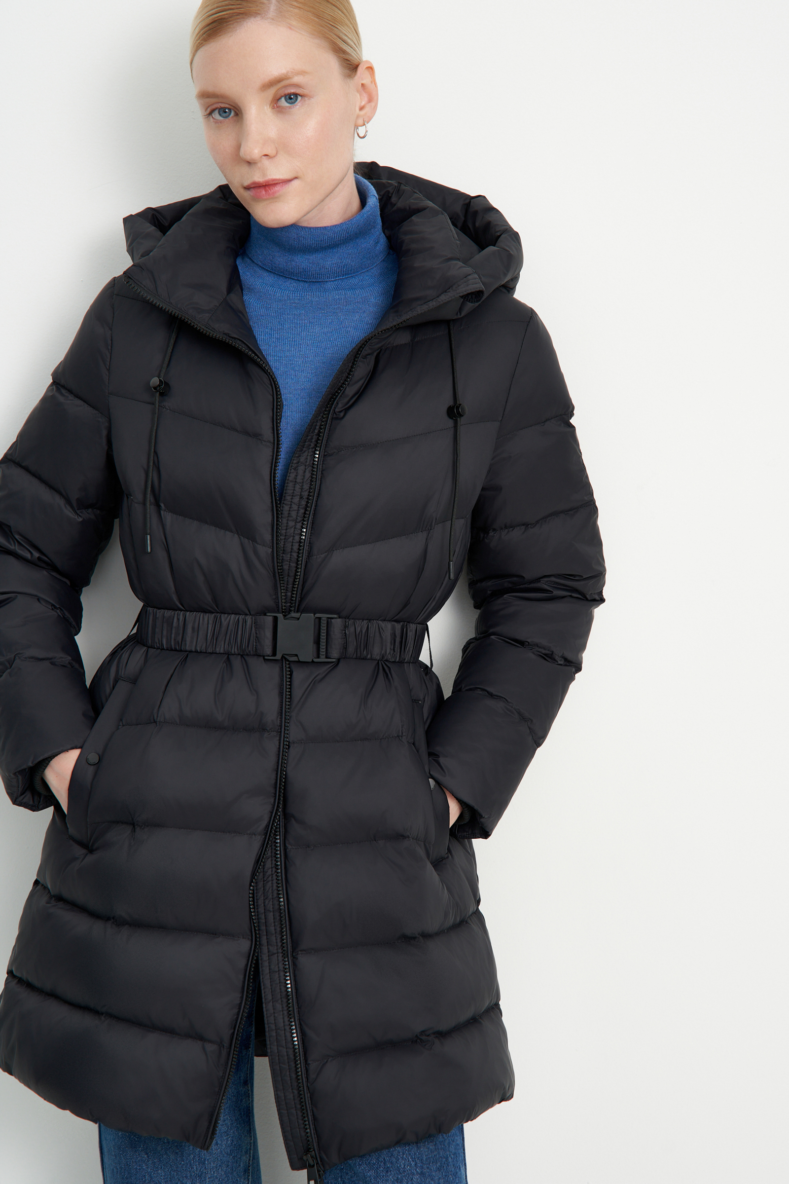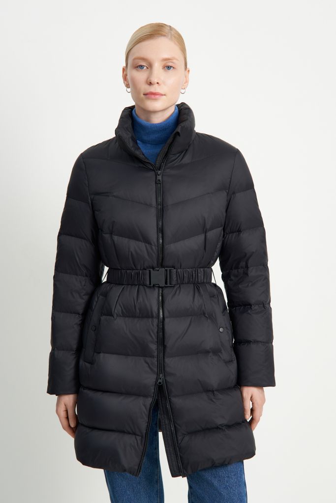 Пуховое полупальто с поясом приталенного силуэта