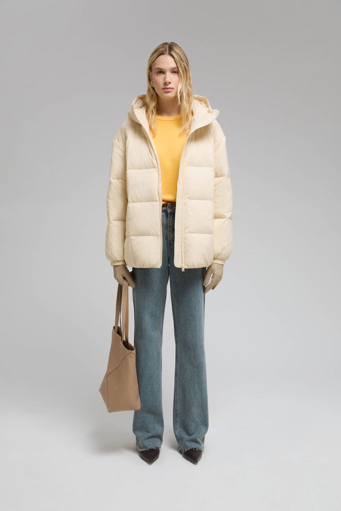 Пуховое пальто с капюшоном и воротником-стойкой