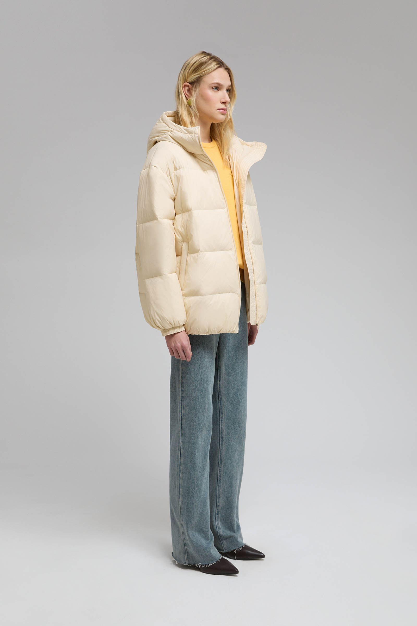 Пуховое пальто с воротником-стойкой и капюшоном