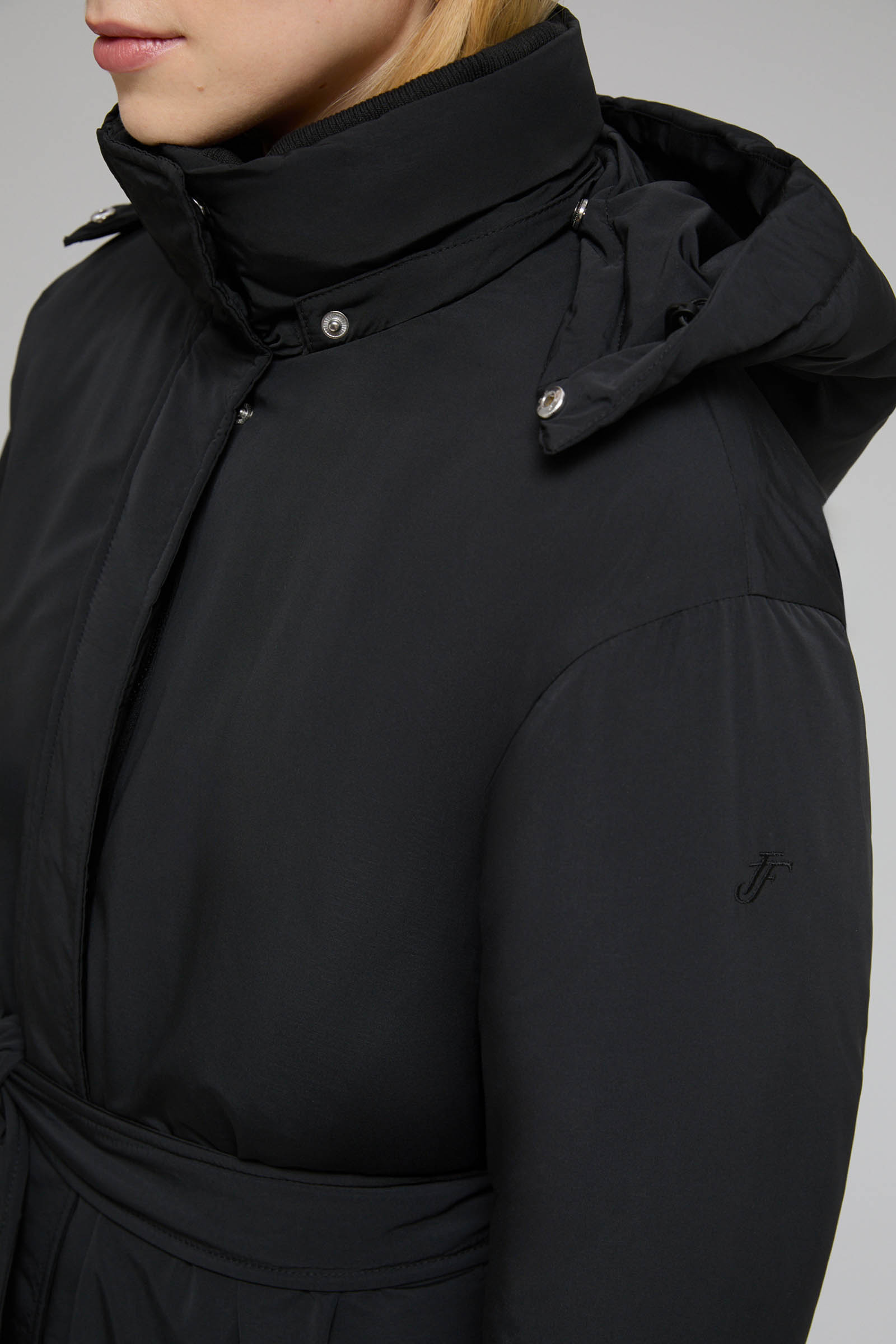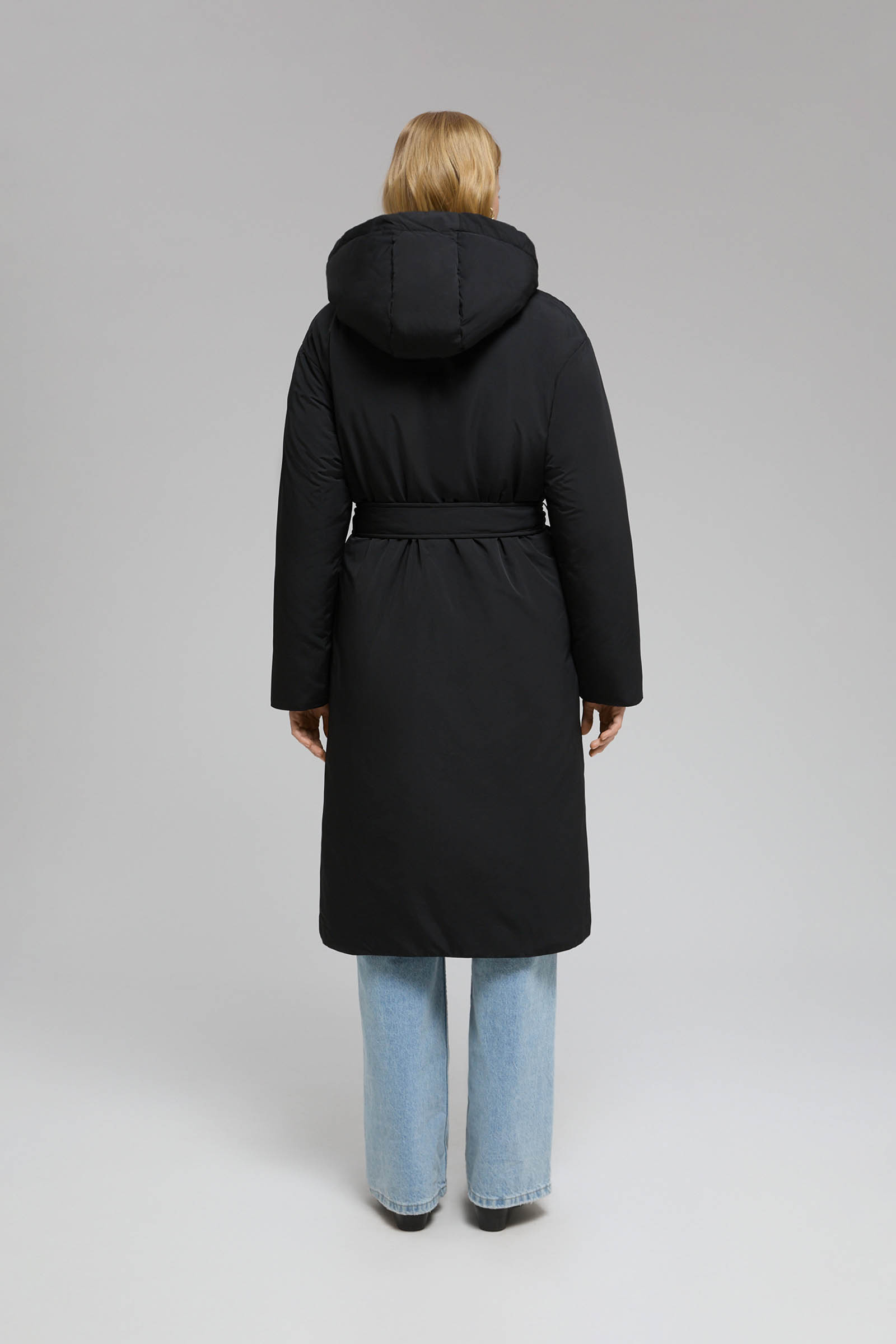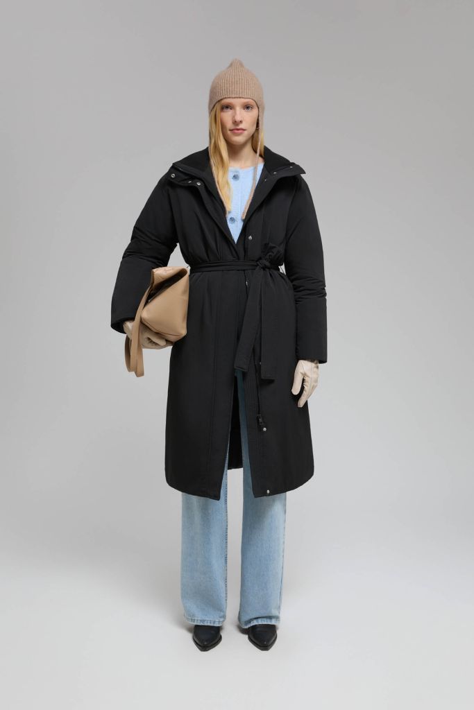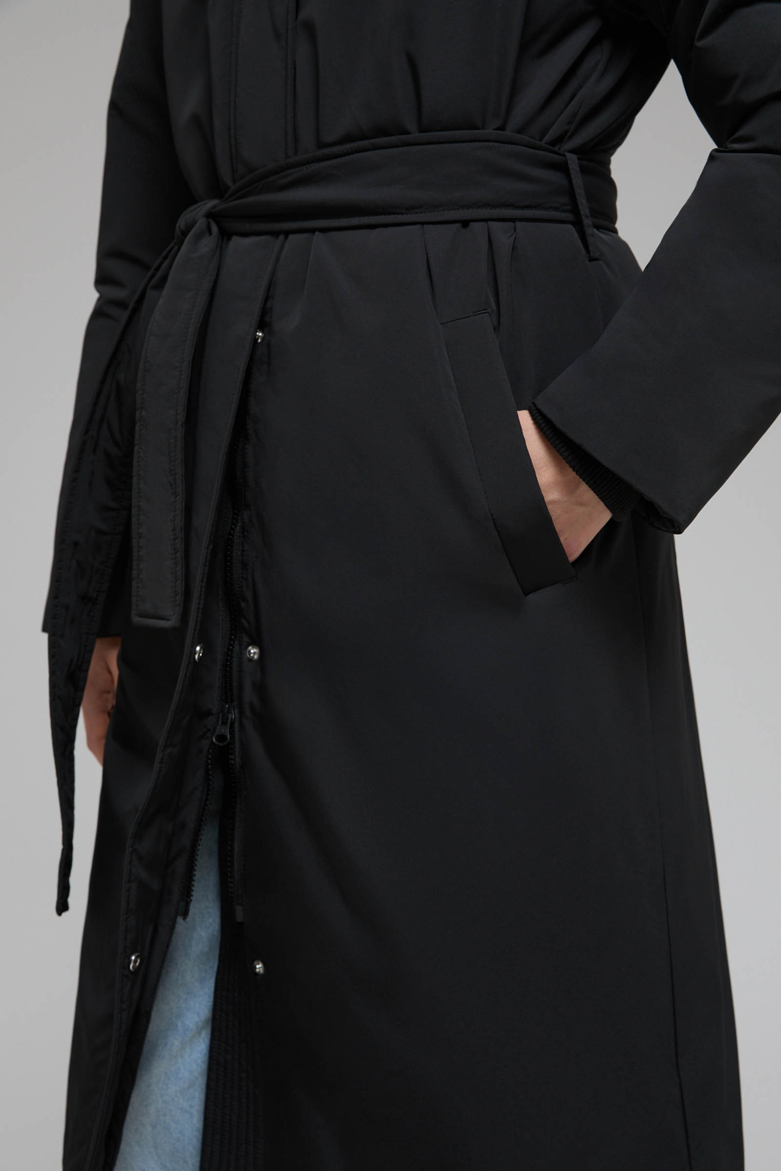 Пуховое пальто с поясом и капюшоном