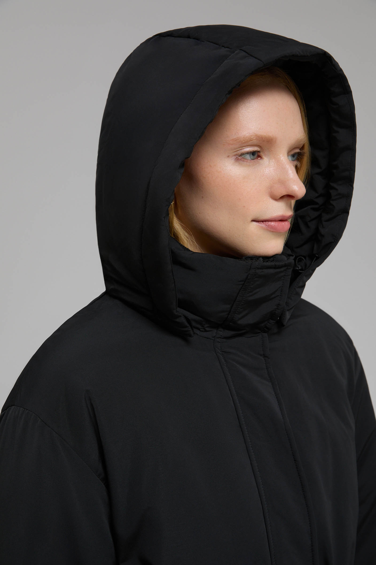 Пуховое пальто с капюшоном и воротником-стойкой
