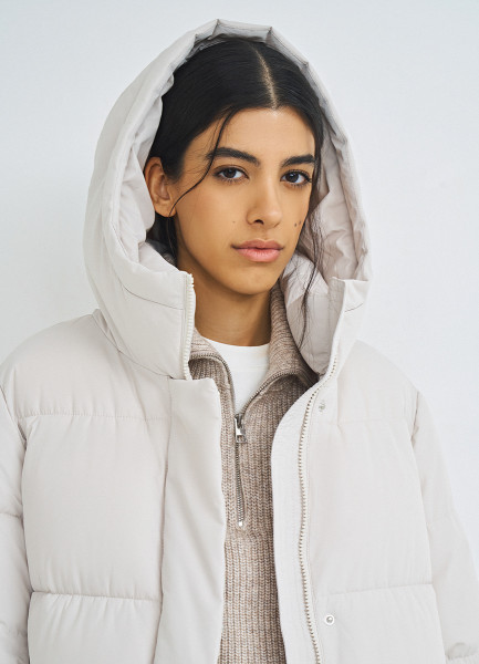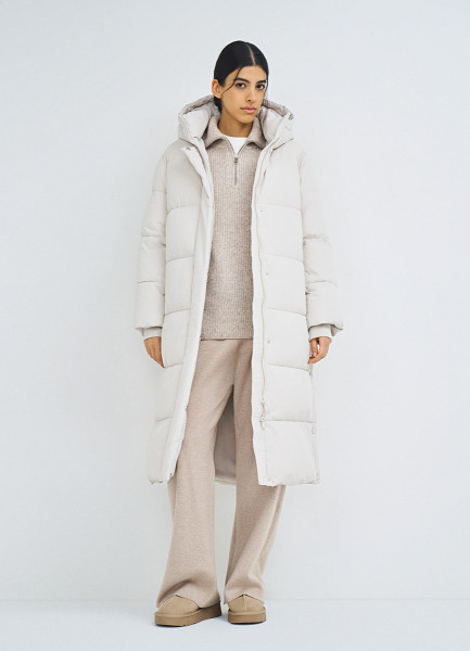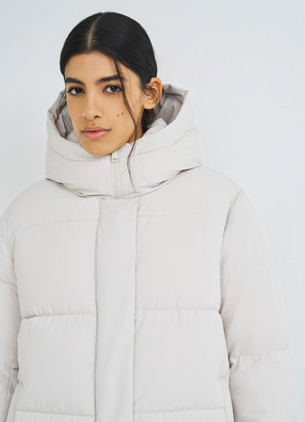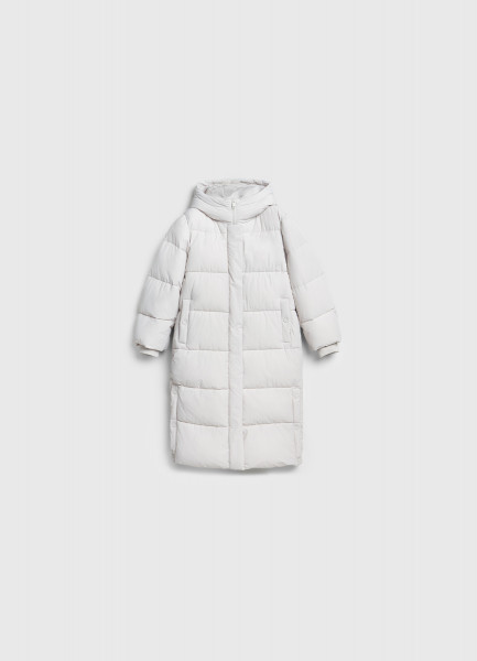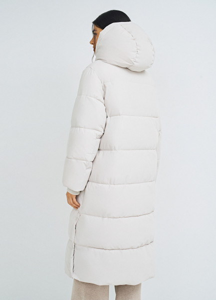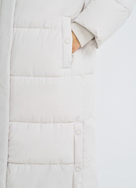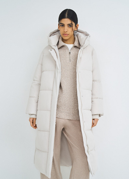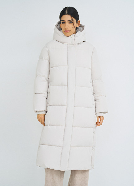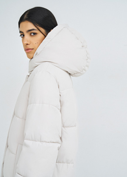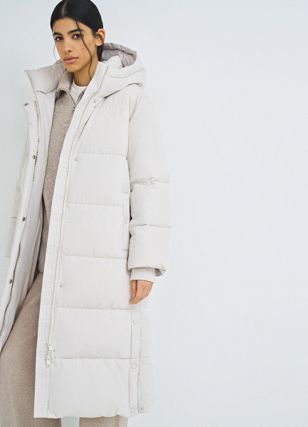 Длинный стёганый пуховик с капюшоном, Бежевый