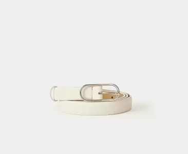 Узкий женский ремень с овальной пряжкой. Выполнен из гладкой кожи с легким естественным блеском.