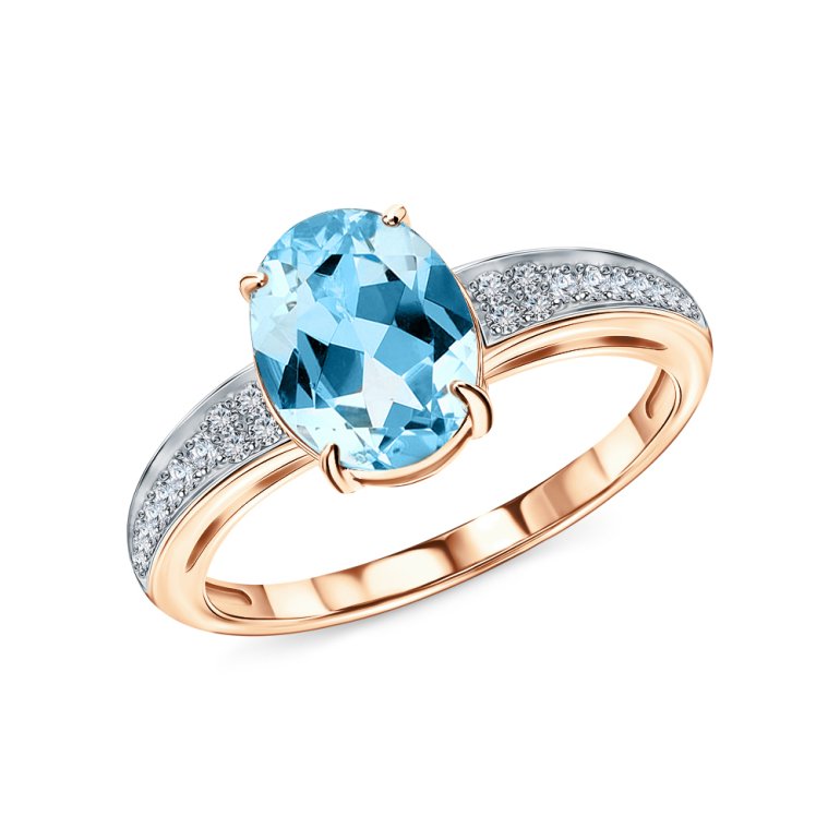 Кольцо с 8 бриллиантами природными, 0.033 карат, огранка круг 17 граней, цвет 2, чистота 2, тип огранки А; 14 бриллиантами природными, 0.03 карат, огранка круг 17 граней, цвет 2, чистота 2, тип огранки А; 1 топазом скай природным, 1.969 карат, тип огранки Б; Розовое золото 585 пробы.