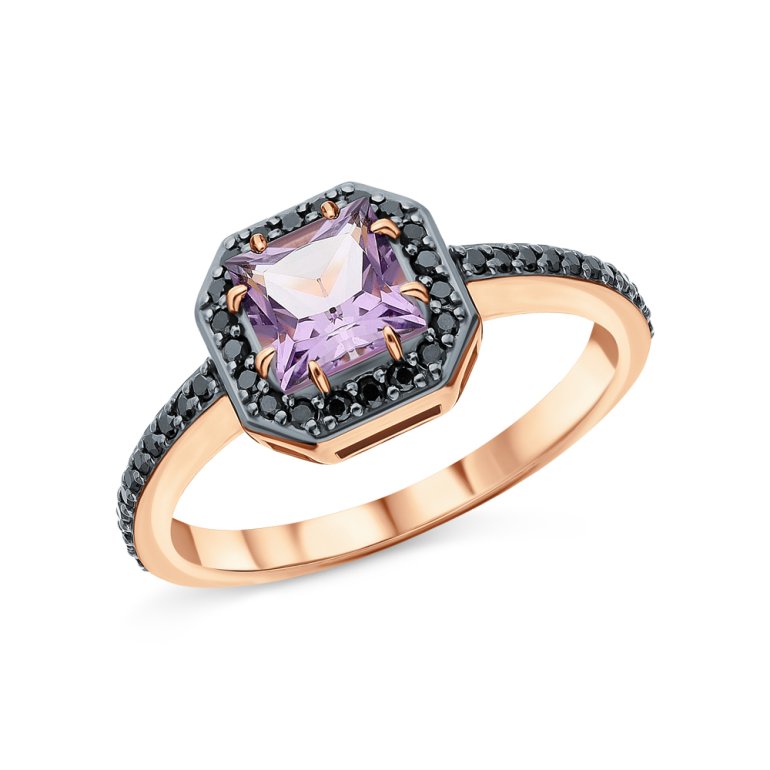 Кольцо с 1 аметистом природным, 0.538 карат, тип огранки Б; 42 бриллиантами черными природными облагороженными, 0.159 карат, огранка круг 57 граней, цвет 7, чистота 6, тип огранки А; Розовое золото 585 пробы.