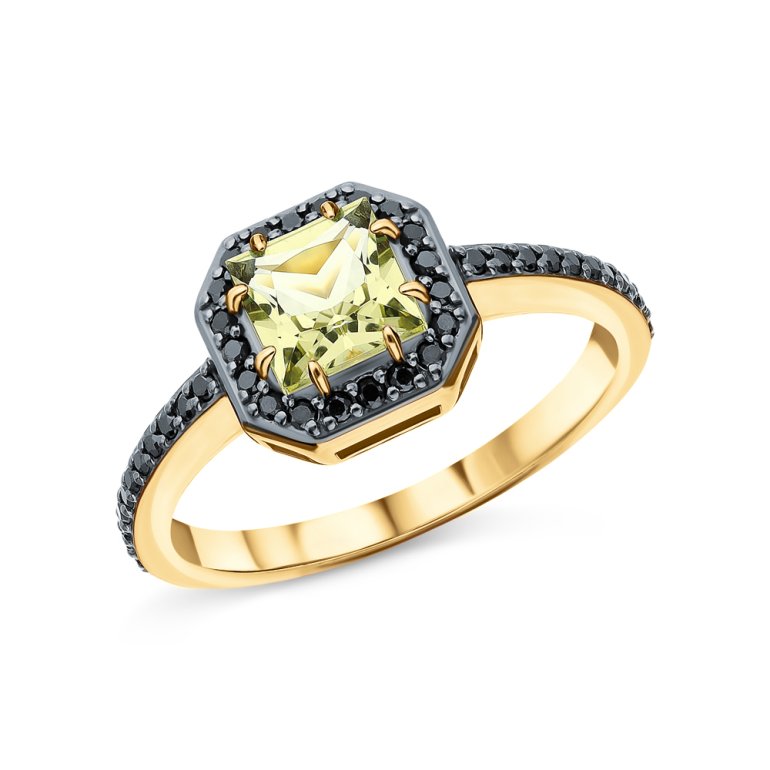 Кольцо с 1 кварцем лимонным природным, 0.569 карат, тип огранки Б; 42 бриллиантами черными природными облагороженными, 0.166 карат, огранка круг 57 граней, цвет 7, чистота 6, тип огранки А; Желтое золото 585 пробы.