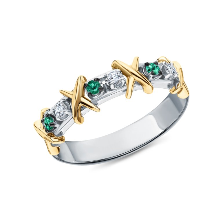 Кольцо с 3 бриллиантами, 0.099 карат, огранка круг 57 граней, цвет 3, чистота 6, тип огранки А; 3 изумрудами природными, 0.085 карат, цвет 3, чистота 3, тип огранки В; Желтое и белое золото 585 пробы.