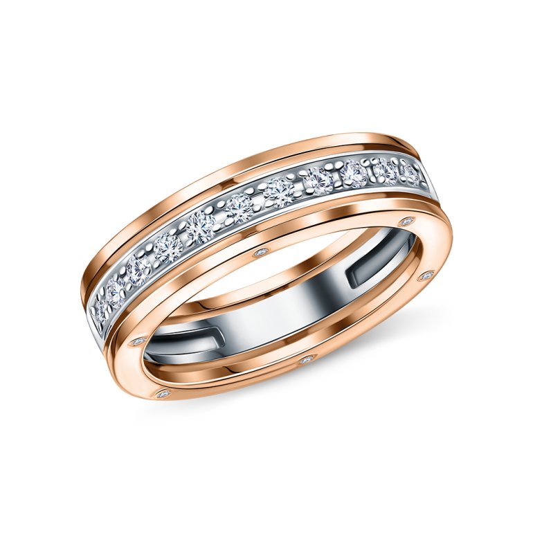 Кольцо с 11 бриллиантами природными, 0.201 карат, огранка круг 57 граней, цвет 3, чистота 6, тип огранки А; 12 бриллиантами природными, 0.026 карат, огранка круг 17 граней, цвет 2, чистота 2, тип огранки А; Розовое и белое золото 585 пробы.