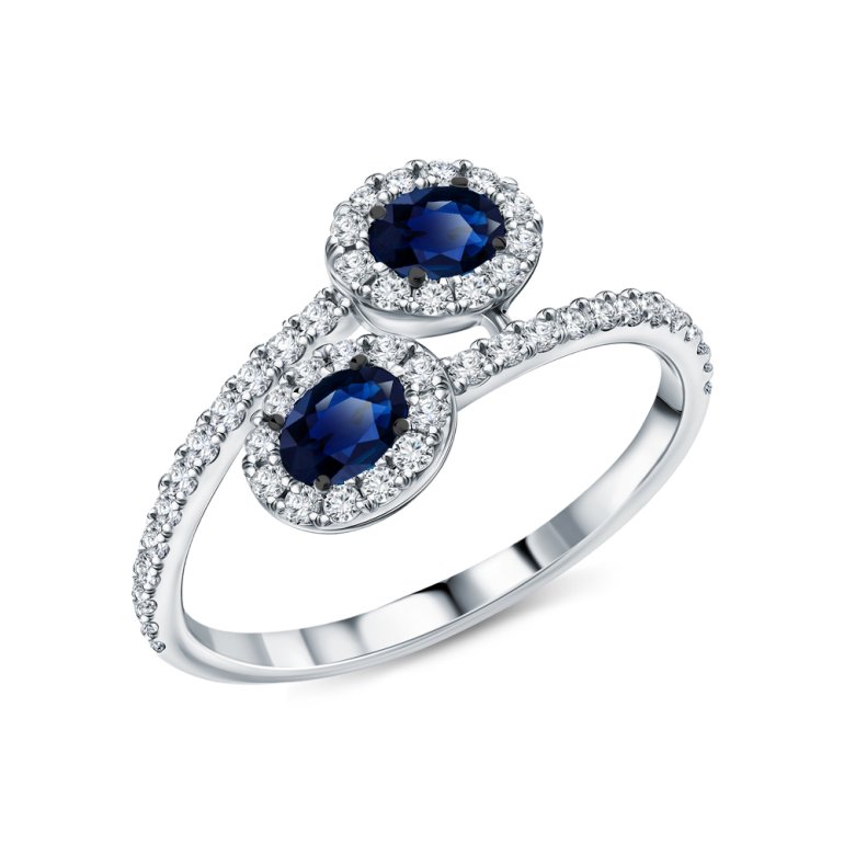 Кольцо с 48 бриллиантами природными, 0.292 карат, огранка круг 17 граней, цвет 2, чистота 3, тип огранки Б; 2 сапфирами природными, 0.462 карат, цвет 3, чистота 4, тип огранки Б; Белое золото 585 пробы.