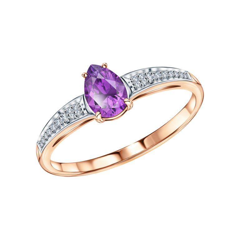 Кольцо с 8 бриллиантами природными, 0.034 карат, огранка круг 17 граней, цвет 2, чистота 2, тип огранки А; 14 бриллиантами природными, 0.03 карат, огранка круг 17 граней, цвет 2, чистота 2, тип огранки А; 1 аметистом природным, 0.631 карат, тип огранки Б; Розовое золото 585 пробы.