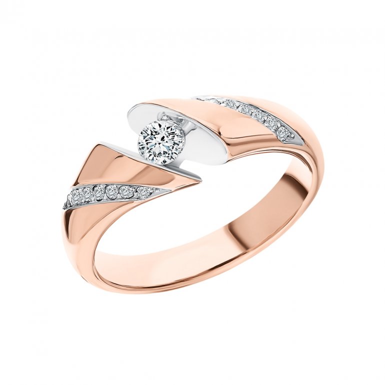 Кольцо с 1 бриллиантом природным, 0.129 карат, огранка круг 57 граней, цвет 3, чистота 6, тип огранки А; 16 бриллиантами природными, 0.065 карат, огранка круг 17 граней, цвет 2, чистота 2, тип огранки Б; Розовое золото 585 пробы.