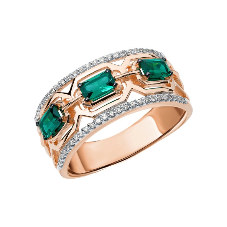 Кольцо с 50 бриллиантами природными, 0.175 карат, огранка круг 17 граней, цвет 2, чистота 2, тип огранки Б; 3 гидротермальными изумрудами, 0.667 карат, тип огранки Б; Розовое золото 585 пробы.