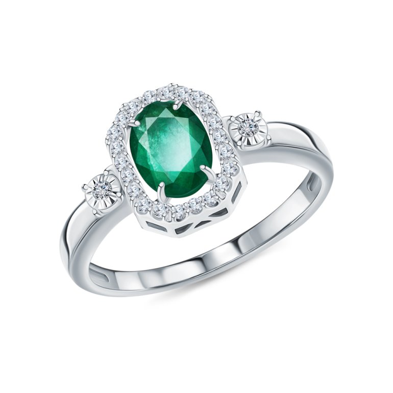 Кольцо с 2 бриллиантами природными, 0.011 карат, огранка круг 17 граней, цвет 2, чистота 2, тип огранки А; 22 бриллиантами природными, 0.09 карат, огранка круг 17 граней, цвет 2, чистота 2, тип огранки А; 1 изумрудом природным, 0.686 карат, цвет 4, чистота 3, тип огранки Б; Белое золото 585 пробы.