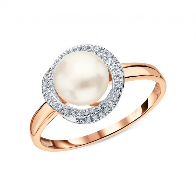 Кольцо с 42 бриллиантами природными, 0.086 карат, огранка круг 17 граней, цвет 2, чистота 2, тип огранки А; 1 жемчугом пресноводным культивированным белым, тип огранки Б; Розовое золото 585 пробы.