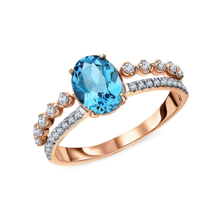 Кольцо с 1 топазом свисс природным, 1.468 карат, тип огранки Б; 10 топазами бесцветными природными, 0.163 карат, тип огранки В; 20 бриллиантами, 0.073 карат, огранка круг 17 граней, цвет 2, чистота 2, тип огранки А; Розовое золото 585 пробы.
