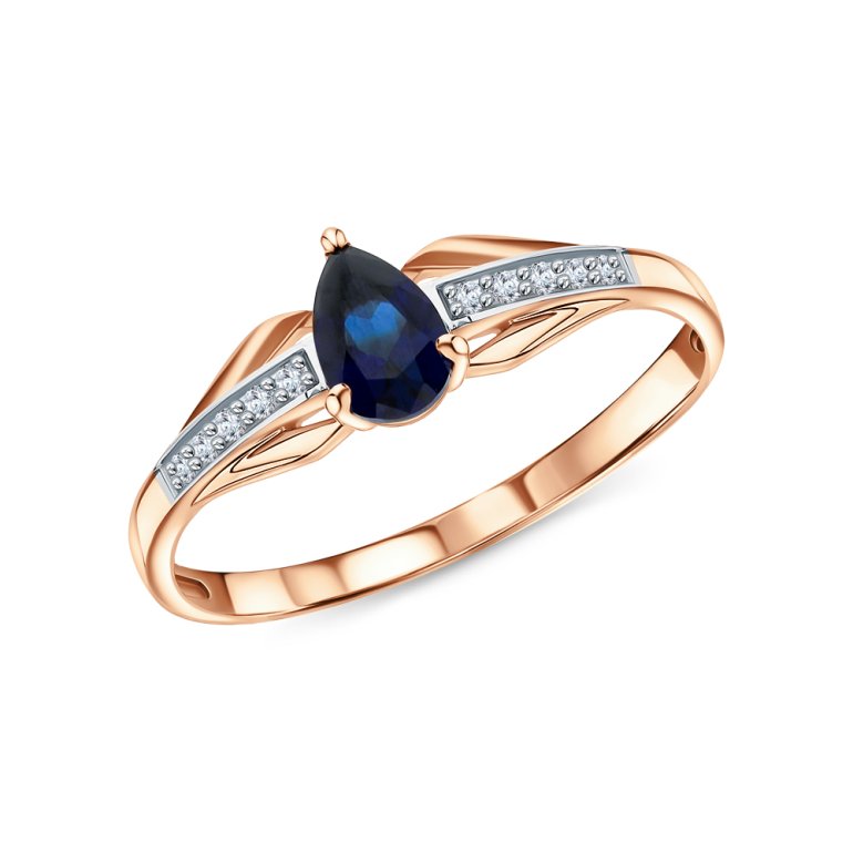 Кольцо с 1 сапфиром синтетическим, 0.467 карат, тип огранки Б; 10 бриллиантами, 0.041 карат, огранка круг 17 граней, цвет 2, чистота 2, тип огранки А; Розовое золото 585 пробы.