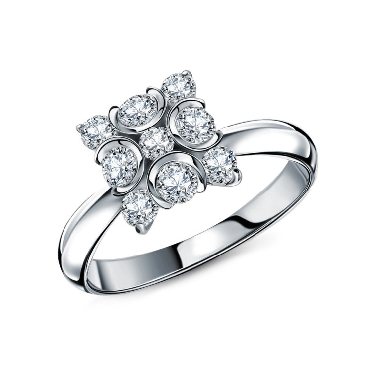 Кольцо с 4 бриллиантами природными, 0.313 карат, огранка круг 57 граней, цвет 3, чистота 6, тип огранки А; 4 бриллиантами природными, 0.201 карат, огранка круг 57 граней, цвет 3, чистота 6, тип огранки А; 1 бриллиантом природным, 0.038 карат, огранка круг 57 граней, цвет 3, чистота 6, тип огранки А; Белое золото 585 пробы.