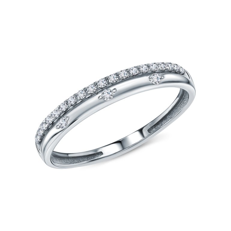 Кольцо с 3 бриллиантами природными, 0.026 карат, огранка круг 17 граней, цвет 2, чистота 2, тип огранки А; 19 бриллиантами природными, 0.054 карат, огранка круг 17 граней, цвет 2, чистота 2, тип огранки А; Белое золото 585 пробы.