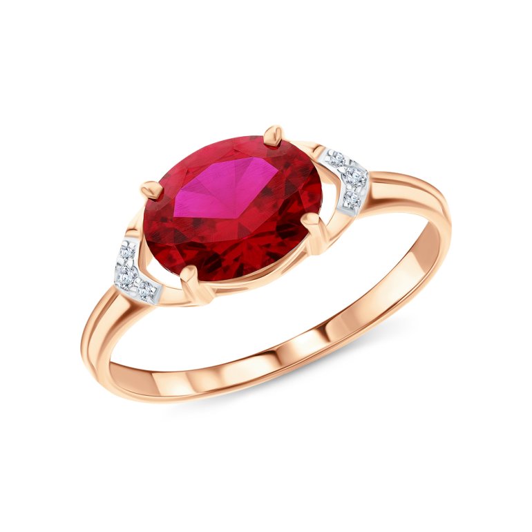 Кольцо с 2 бриллиантами природными, 0.016 карат, огранка круг 57 граней, цвет 3, чистота 6, тип огранки А; 4 бриллиантами природными, 0.009 карат, огранка круг 17 граней, цвет 2, чистота 2, тип огранки Б; 1 рубином синтетическим, 2.17 карат, тип огранки Б; Розовое золото 585 пробы.