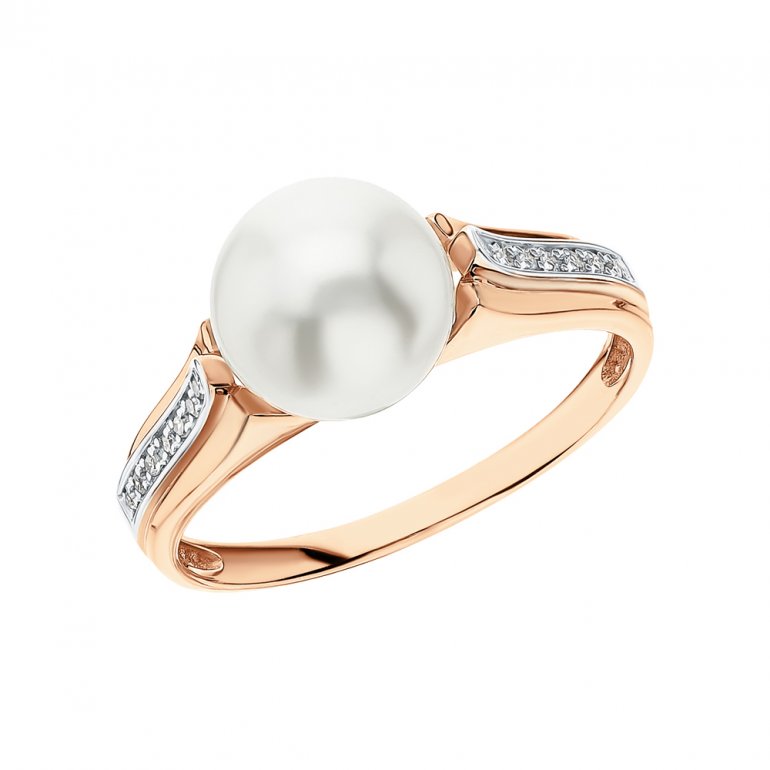 Кольцо с 14 бриллиантами, 0.035 карат, огранка круг 17 граней, цвет 2, чистота 2, тип огранки А; 1 жемчугом пресноводным культивированным белым, тип огранки В; Розовое золото 585 пробы.