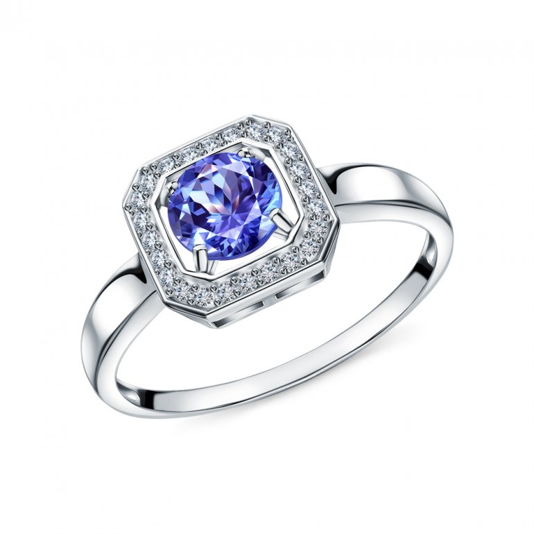 Кольцо с 1 танзанитом, 0.829 карат, тип огранки В; 24 бриллиантами, 0.072 карат, огранка круг 17 граней, цвет 2, чистота 2, тип огранки Б; Белое золото 585 пробы.